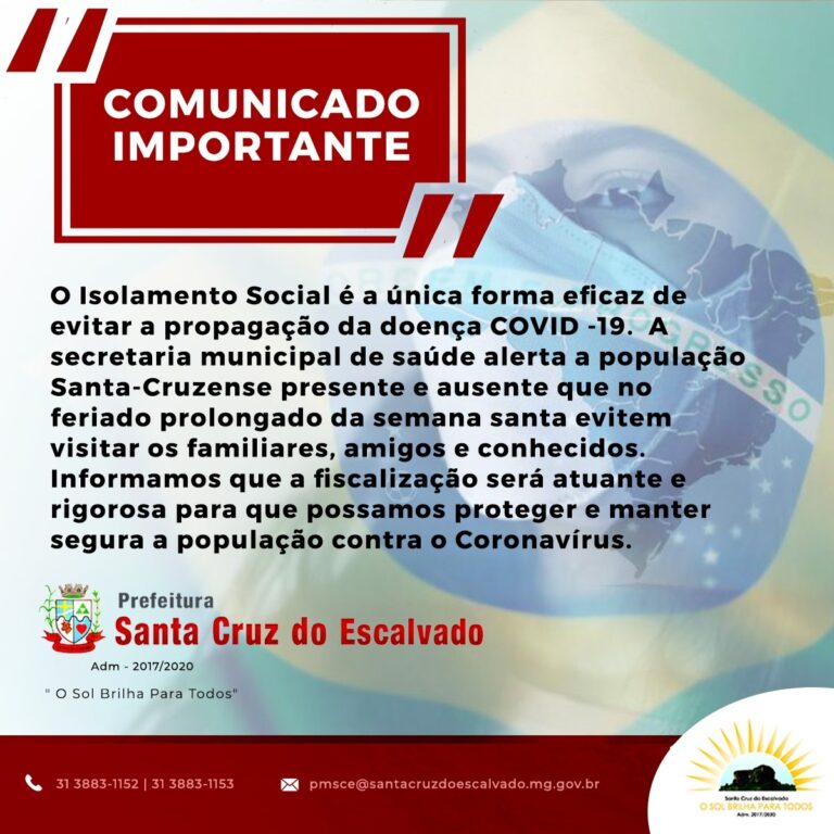 A Prefeitura e a Defesa Civil que devido a pandemia do Coronavírus e o feriado prolongado da Semana Santa pedimos que não venham a Santa