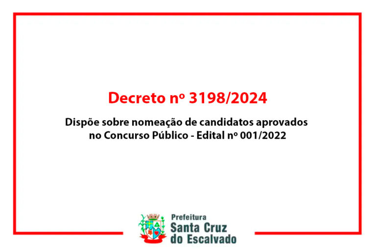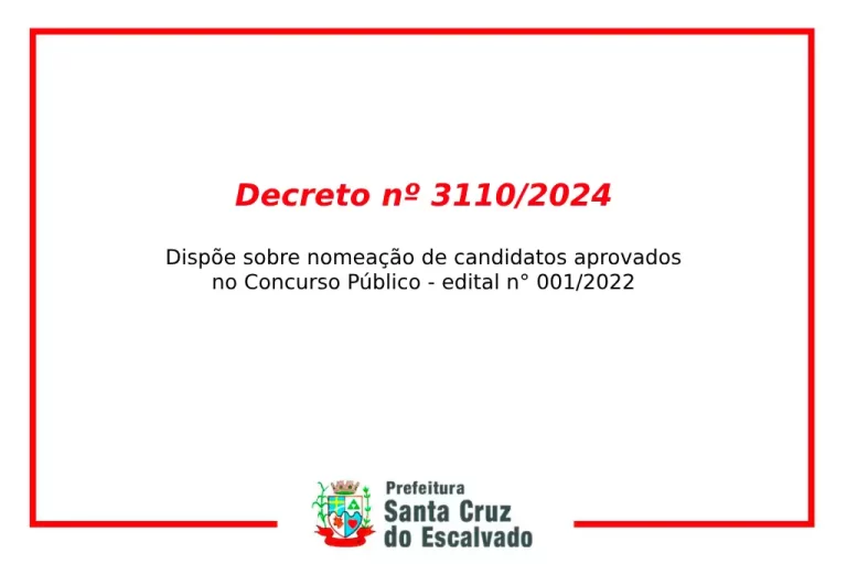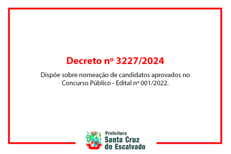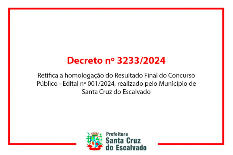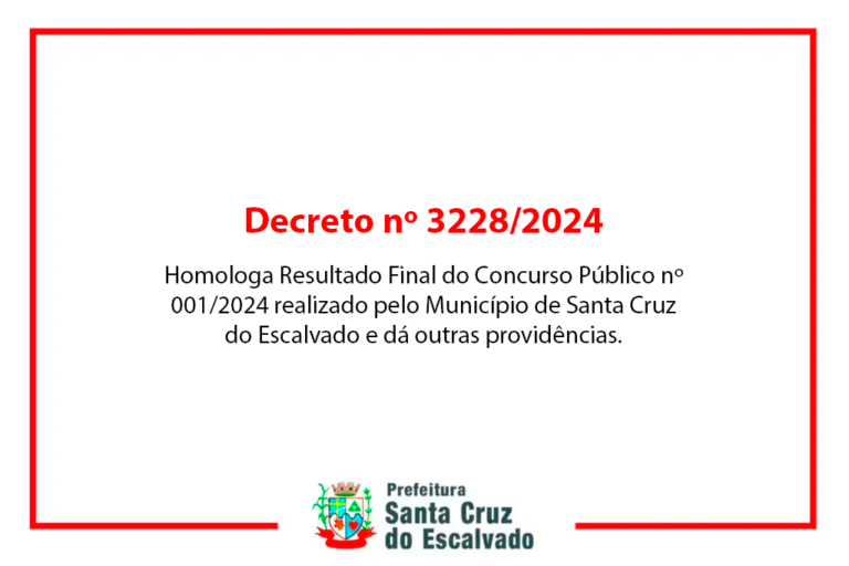 Homologa Resultado Final do Concurso Público nº 001/2024 realizado pelo Município de Santa Cruz do Escalvado e dá outras providências. DECRETO 3228