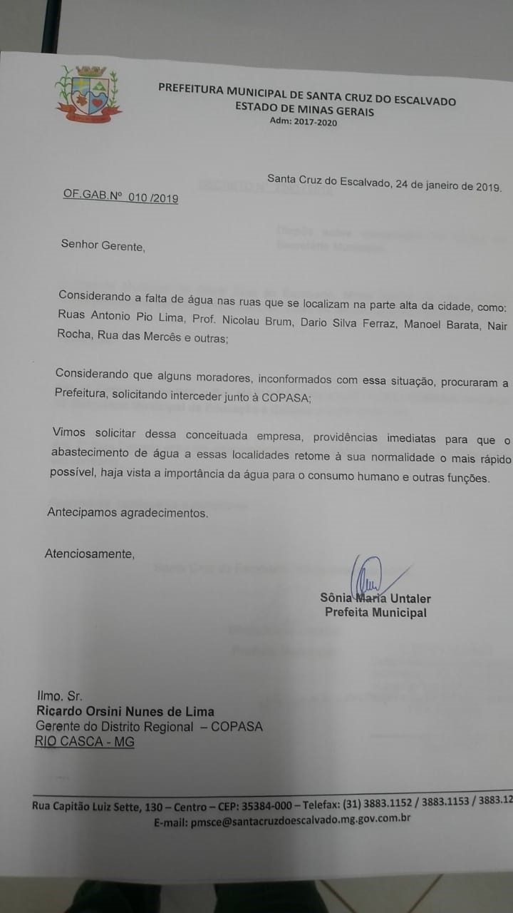 A prefeita preocupada com a falta de água oficializou a Copasa para que se resolva a questão de abastecimento no município. Estamos atentos e aguardando