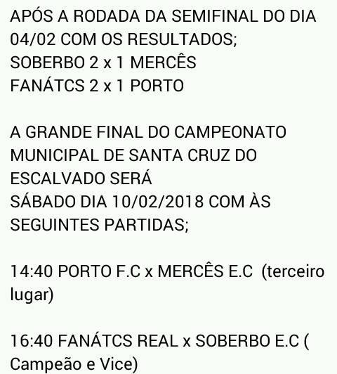 A grande final do campeonato municipal de Santa Cruz do Escalvado será Sábado (10/02/2018).