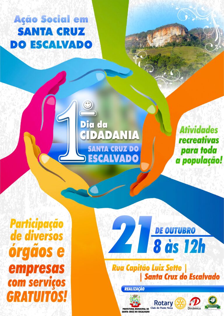Dia: 21 de outubro de 2017Horário: Das 08:00h ás 12:00hLocal: Rua Capitão Luiz Sette – Santa Cruz do Escalvado Ouça o audio abaixo: {mp3}diadacidadania{/mp3}