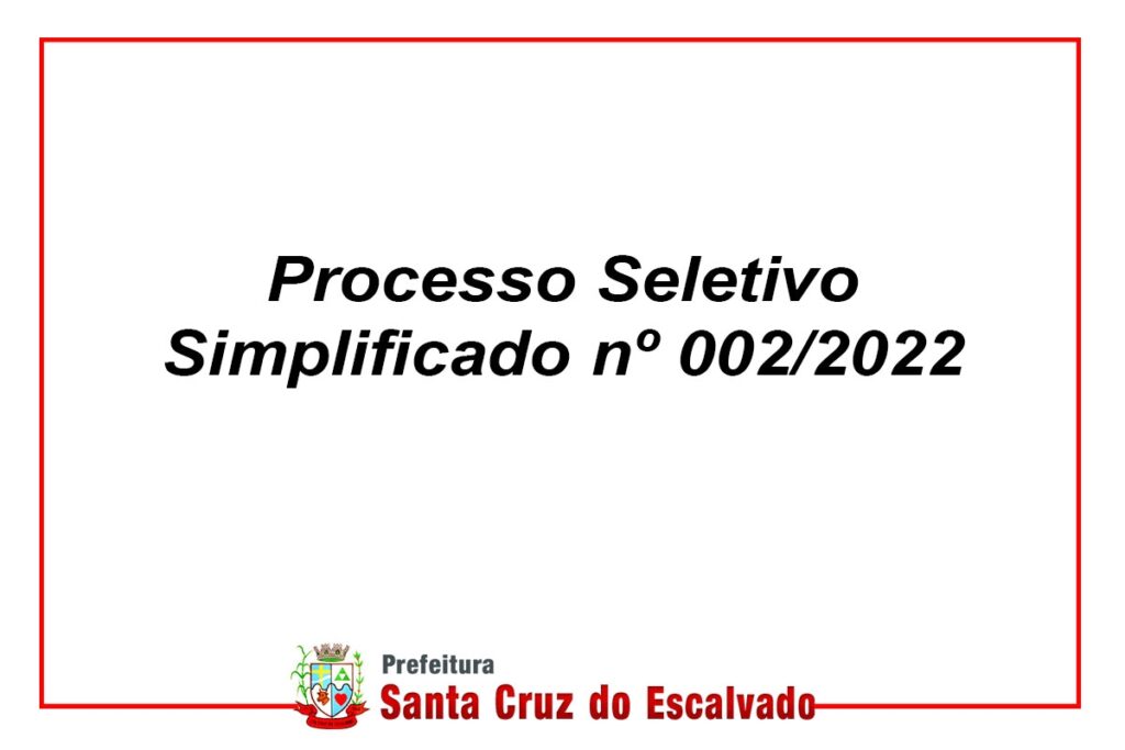 O Município de Santa Cruz do Escalvado/MG, torna público que estarão abertas, do dia 11 ate 13 de abril de 2022 as inscrições para o Processo Seletivo Simplificado Nº 002/2022, visando a contratação de pessoal por prazo determinado para os cargos específicos no Anexo II deste Edital.