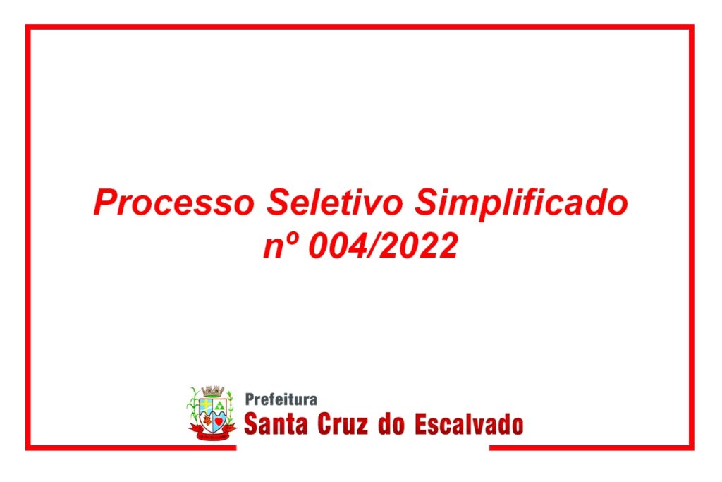 O Município de Santa Cruz do Escalvado/MG, torna público que estarão abertas, do dia 19 até 21 de dezembro de 2022, as incrições para o PROCESSO SELETIVO SIMPLIFICADO Nº 004/2022, visando a contratação de pessoal por prazo determinado para os cargos especificados no Anexo II deste Edital.
