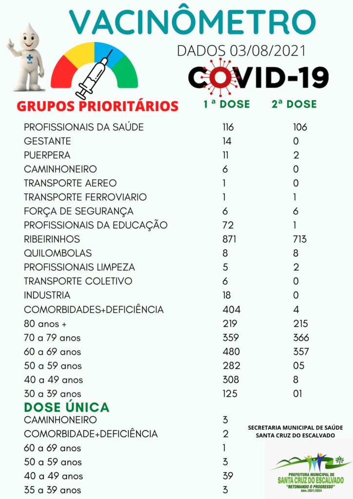 VACINÔMETRO: Visando dar transparência e publicidade à execução da vacinação contra a COVID-19, a Secretaria Municipal de Saúde de Santa Cruz do Escalvado segue com a vacinação em observância a ordem de prioridade de vacinação da COVID-19 conforme determina o Ministério da Saúde.