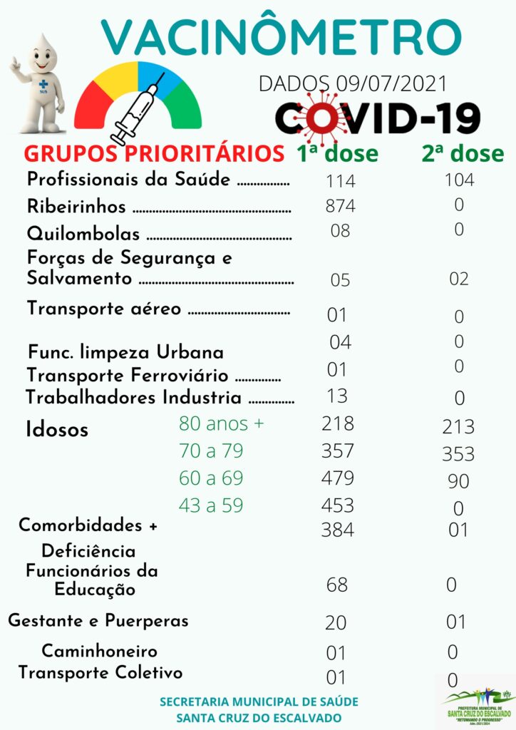 VACINÔMETRO: Visando dar transparência e publicidade à execução da vacinação contra a COVID-19, a Secretaria Municipal de Saúde de Santa Cruz do Escalvado segue com a vacinação em observância a ordem de prioridade de vacinação da COVID-19 conforme determina o Ministério da Saúde.